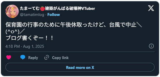 — たまーてむ🍅建築がんばる破壊神VTuber (@tamatimlog) August 1, 2025