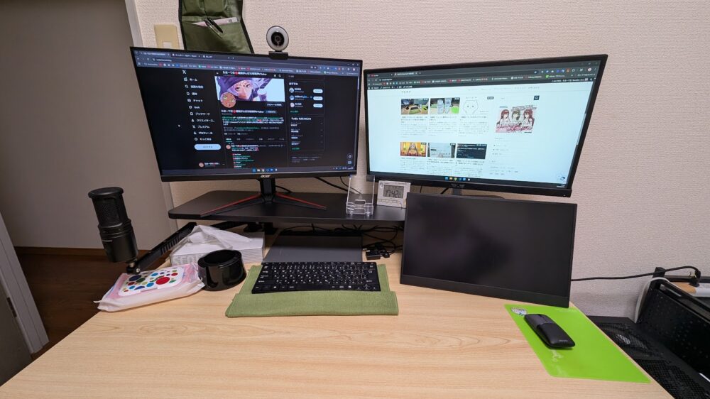 もとからあったモニター2台はモニタースタンドの上に、今回買ったタッチモニターはモニタースタンドの前に置くようにした。